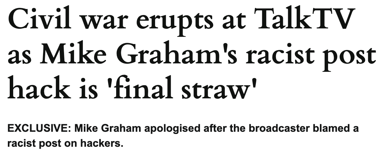 Every so often the outrage machine seems to forget exactly who it’s supposed to be angry at and ends up biting its own arse - which is exactly what happened this week when Talk TV’s Mike Graham “stepped back” after an appalingly racist post appeared on his Facebook page - one he is terribly insistent came from hackers who have a suspiciously intimate knowledge of his usual vocabulary and access to his photos.