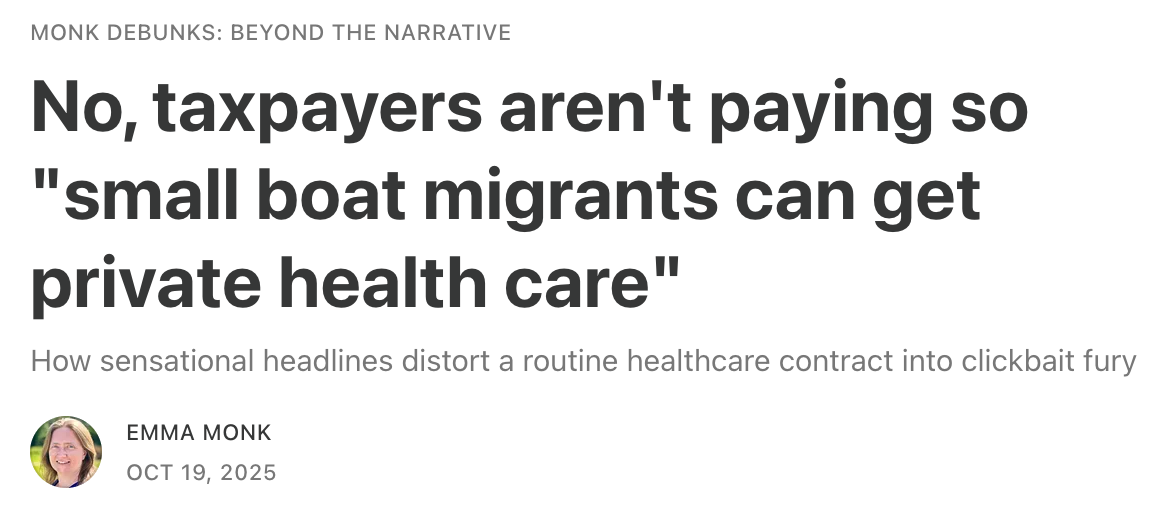 has once again done the public service of prising fact from froth.Her piece this week is a thorough debunk of the Express and Sun’s gleefully misleading “£60 million for small boat migrants’ private healthcare” headlines in which she debunks and calmly dismantles yet another case study in synthetic outrage being pushed by tabloids.