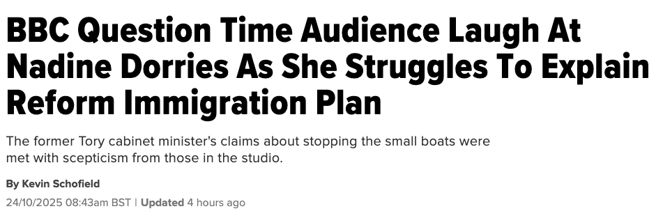 Taking the dedicated Reform UK seat on BBC Question Time, Dorries did her level best to explain the grand immigration plan cooked up by Reform - a plan that, like most other policies cooked up by right-wing populists, could fit neatly on a pub coaster and instantly collapses the moment you apply even the lightest scrutiny.