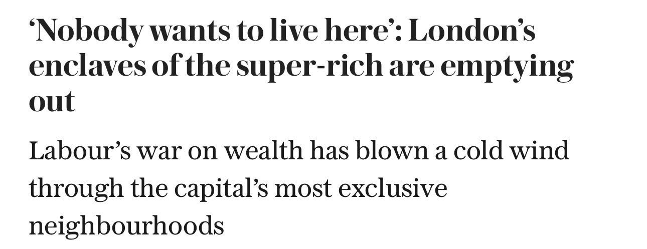 The Telegraph has devoted an entire series of articles this week to what it, not at all dramatically, calls “Labour’s war on wealth”, lamenting the unbearable suffering of millionaires who have, shock-horror, been forced to lower the asking prices on their Knightsbridge mansions. “Lights-out London” is how one estate agent described it, presumably while holding smelling salts and mentally downgrading the trim level of their next Porsche.