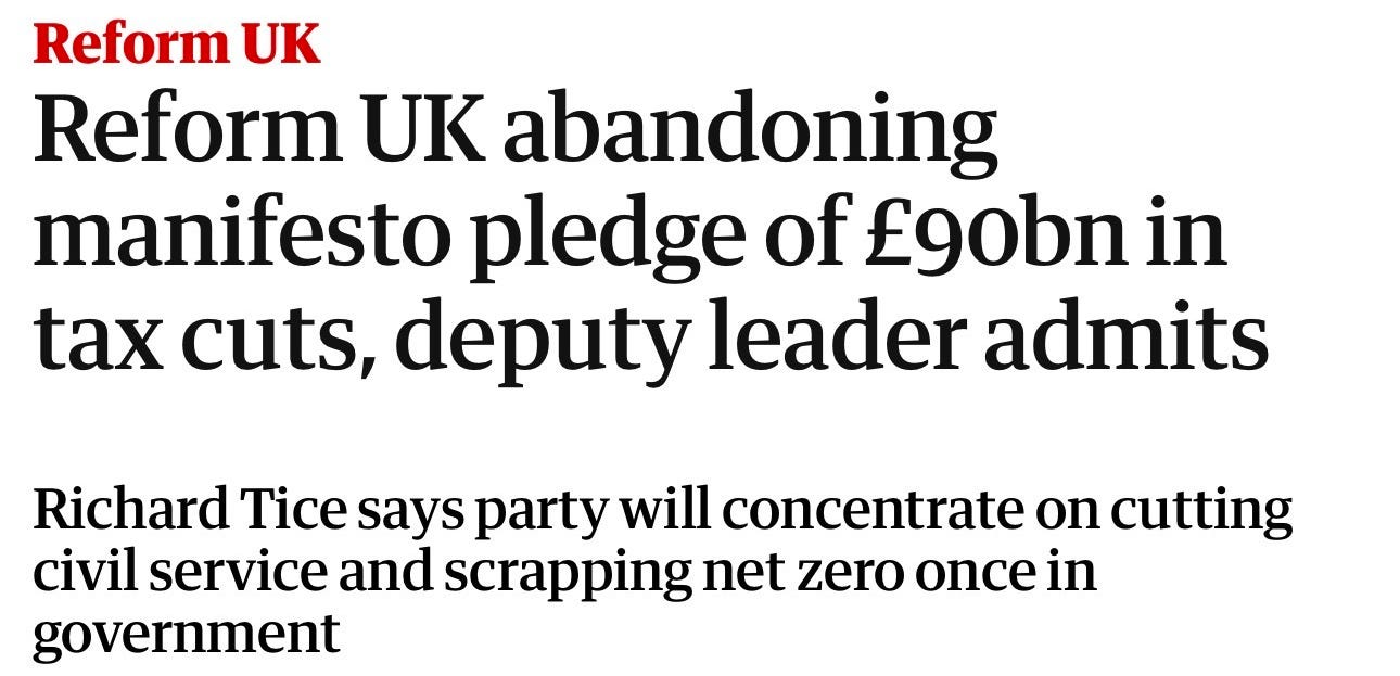 It happened somewhere between their announcements of £90 billion in tax cuts and funding it all with “efficiency savings”. Richard Tice, the deputy leader and part-time resident of the UK has now said that the party is abandoning their flagship fiscal fantasy and will instead now focus on cutting the civil service and scrapping Net-Zero, presumably because shouting at bureaucrats and trees cost less than basic lessons in mathematics.