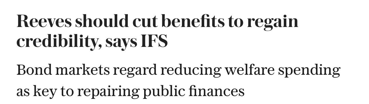 I do have questions though - questions like by how much? Which benefits? And, most importantly, how, exactly, does making poor people poorer help the government to “regain” credibility. The media is, of course, happy to amplify this message as though the IFS has discovered a brand-spanking new law of physics that somehow translates into “cuts = confidence.”