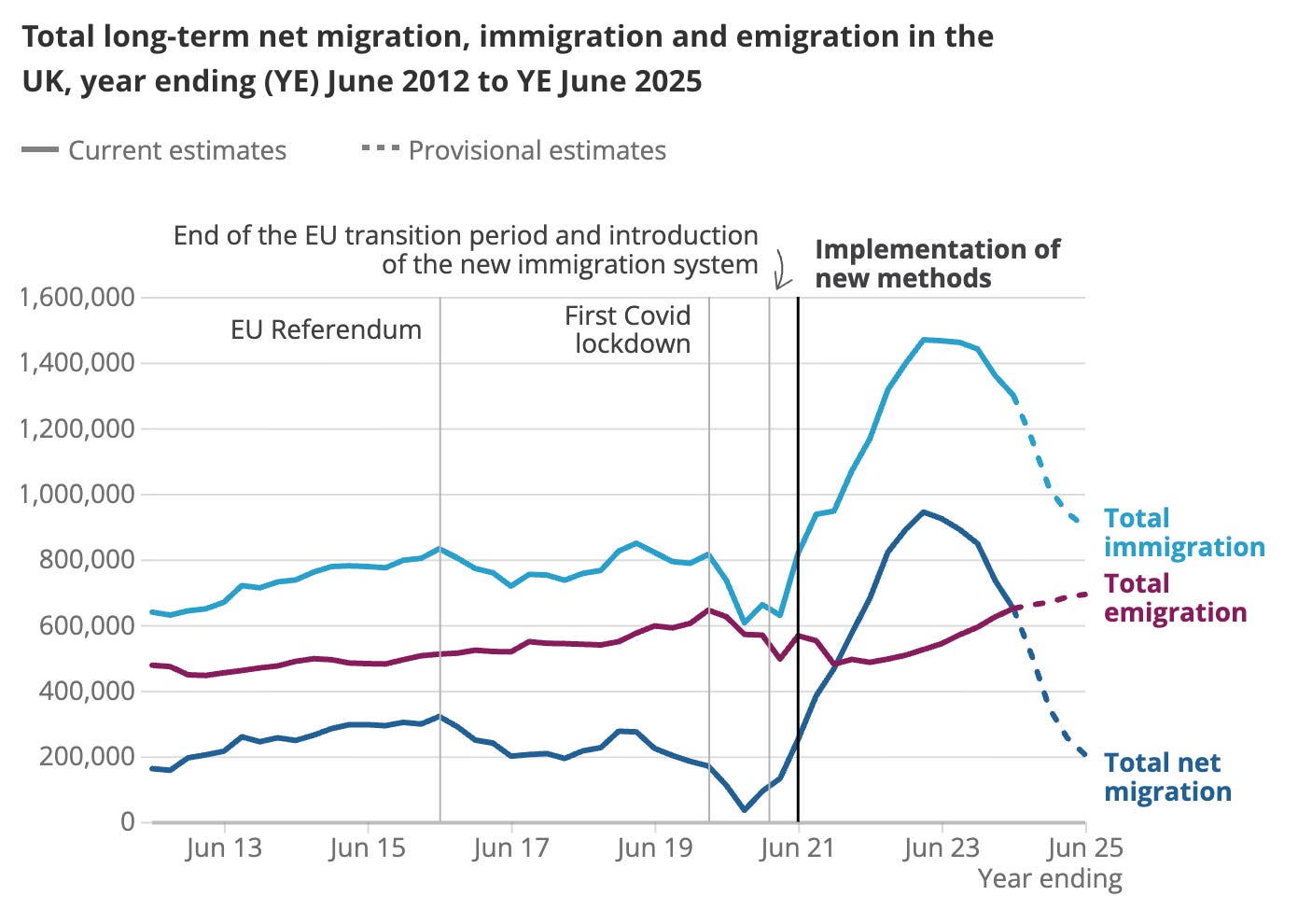 What the UK has done since 2024 has not been a modest recalibration of the immigration system. It has not been a case of “bringing things under control” in any sort of neat, technocratic sense. It has been one of the sharpest reversals in migration policy the country has seen in modern times. Net migration has fallen from 944,000 in the year to March 2023 to 204,000 by June 2025.