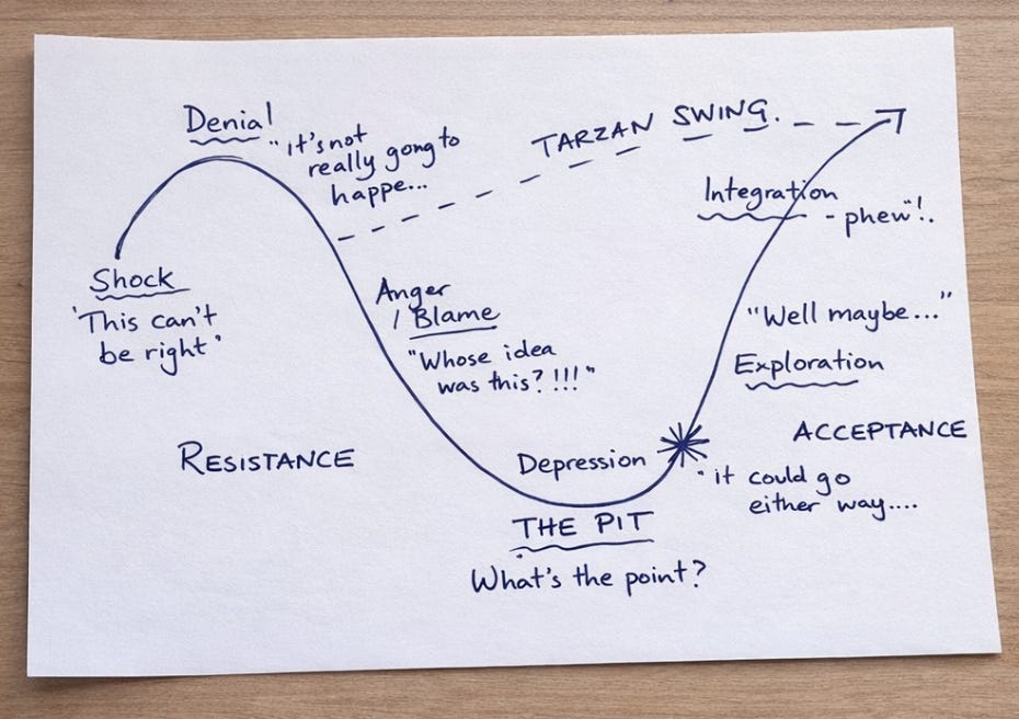 The reality is that change processes can get stuck here for aeons. It is the most uncomfortable place to be during times of change, and if there were easy ways to avoid it, we likely would never be in it. Therapists and coaches can go round and round a pit with clients without even getting close because it isn’t bloody safe in there. But, for change to stick well there is no choice but to go through it.... there is no cavalry, which is kind of depressing. We ask ourselves: “What’s the point of all this? Were things better as they were, even though we hated them? At least we could complain!”